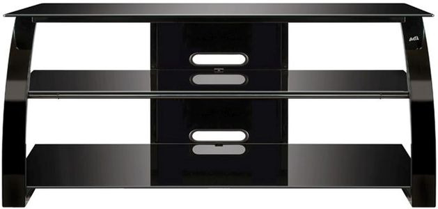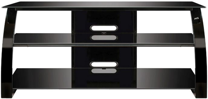 This contemporary audio/video furniture is designed to hold most Flat Panel TVs up to 55" or 125 lbs., and at least four audio/video components. The metal frame is accented by a sleek curved front, and features a beautiful High Gloss Black scratch resistant, powder-coated finish.Read More