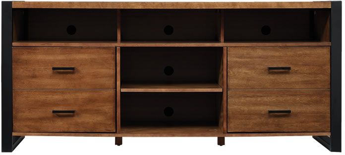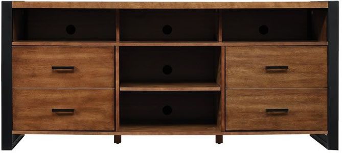 Contemporary meets industrial in this attractive TV stand. The plank top and Old World Birch finish give it a unique look while black frame legs provide a striking contrast. This unit holds TVs up to 70" or up 105 lbs. and offers ample storage, perfect for storing media accessories.Read More
