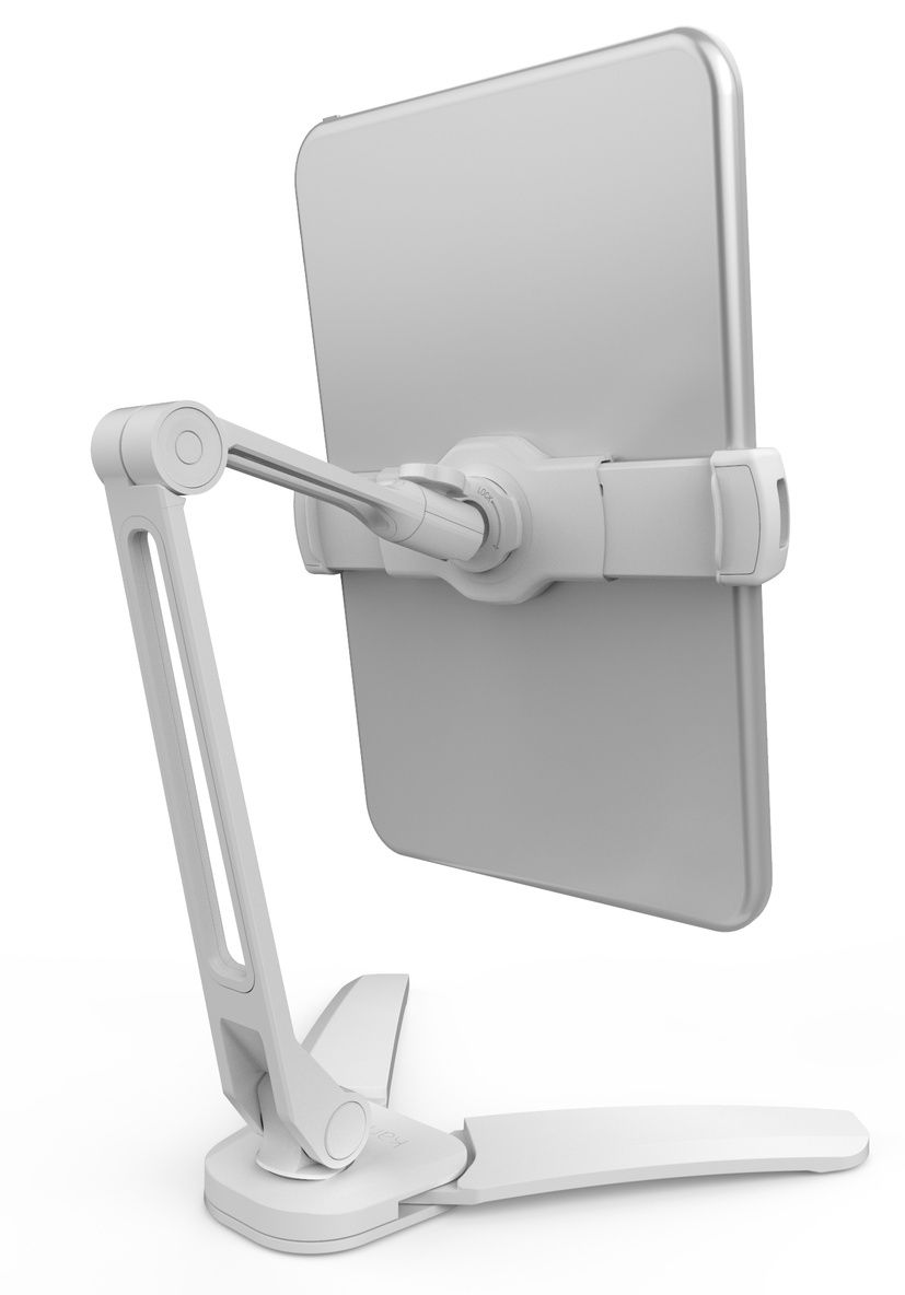 This phone and tablet mount has a foldable base designed to be easy to store and carry, and ensures stability on flat surfaces.